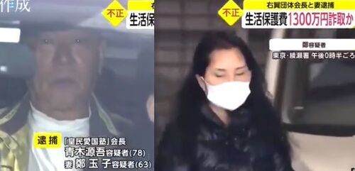 「皇民愛国塾」会長の青木源吾容疑者と、妻で韓国籍の鄭玉子(チョン・オクチャ)容疑者が生活保護費およそ1,300万円をだまし取った疑いで逮捕。