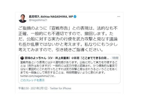 長島昭久「公船に対する実力行使を武力攻撃とみなす議論も些か乱暴では」