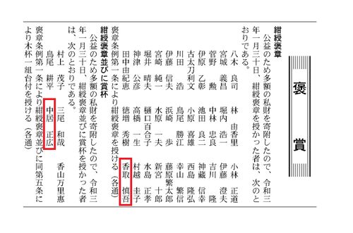 元SMAP中居正広、香取慎吾が多額寄附で紺綬褒賞を受賞、官報