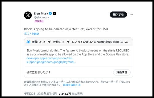 イーロンマスク「DM以外はブロックを無くす」⇒コミュニティーノート「アップストアやグーグルプレイストアの規約違反だから実施されない」?