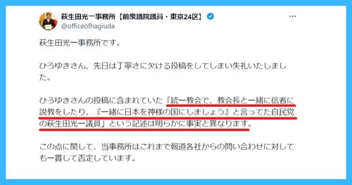 萩生田光一事務所、ひろゆきに詳細反論「教会長と一緒に説教・日本を神様の国に」は事実無根