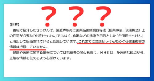 NHK『番組紹介の台所用せっけんをめぐる健康被害の情報は把握していません』「農家がつくった石鹸」回答の疑問