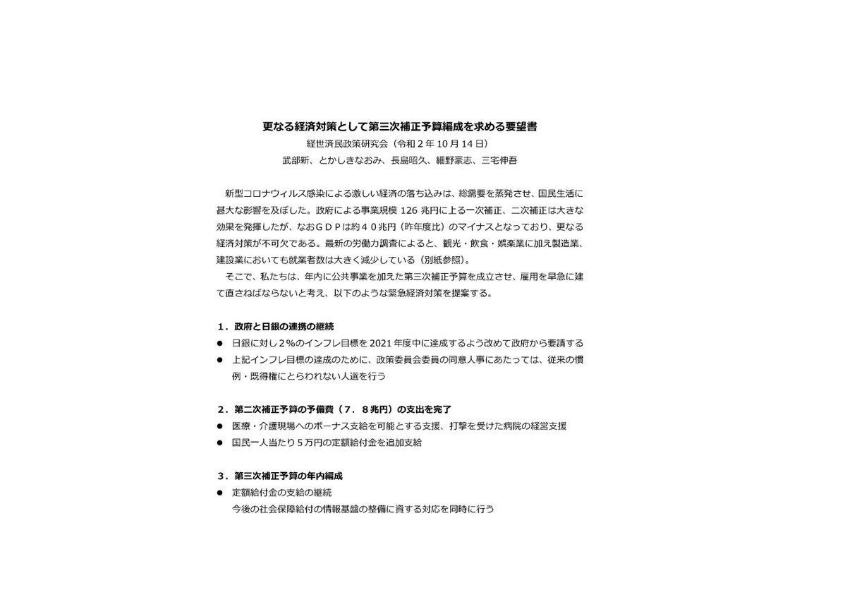 私達「経世済民」政策研究会の総理提言に盛り込んだ特別定額給付金につき、誤解が広がっているので一言補足します。提言をご覧頂けばわかると思いますが、国民一人5万円の追加給付金は第二次補正予算の予備費の残り約7兆円から。第三次補正予算で継続を求めたものの「15」等との数字は出してません。 pic.twitter.com/UXkW76qknQ