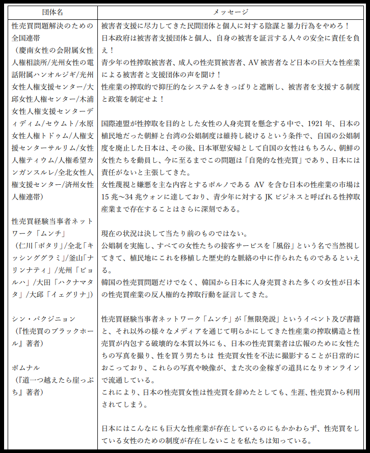 韓国の複数の女性人権団体からは、日本の現状について「韓国から日本に人身売買された多くの女性が日本の性売買産業の反人権的な搾取行動を証言してきた」「JK ビジネスと呼ばれる性搾取産業」「日本軍慰安婦として自国の女性はもちろん、朝鮮の女性たちを動員し、今に至るまでこの問題は「自発的な性売買」であり、日本には責任がないと主張してきた。」等、批判が展開されました。