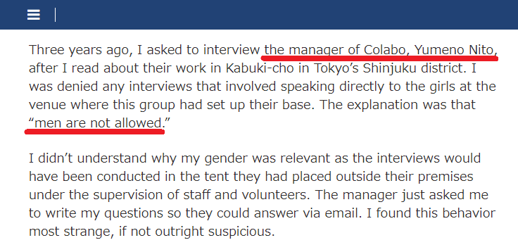 Three years ago, I asked to interview the manager of Colabo, Yumeno Nito, after I read about their work in Kabuki-cho in Tokyo’s Shinjuku district. I was denied any interviews that involved speaking directly to the girls at the venue where this group had set up their base. The explanation was that “men are not allowed.”