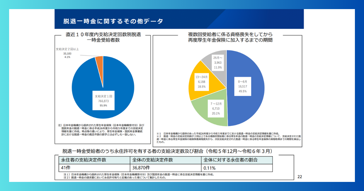 というのは、脱退一時金の支給を受けた後に再度入国した当該外国人の年金番号は別のものが割り振られることになっており、従前は事実上、紐づけが困難な状況だったと言われていたからです。そのため、この円グラフのようなデータは出てきませんでした。
