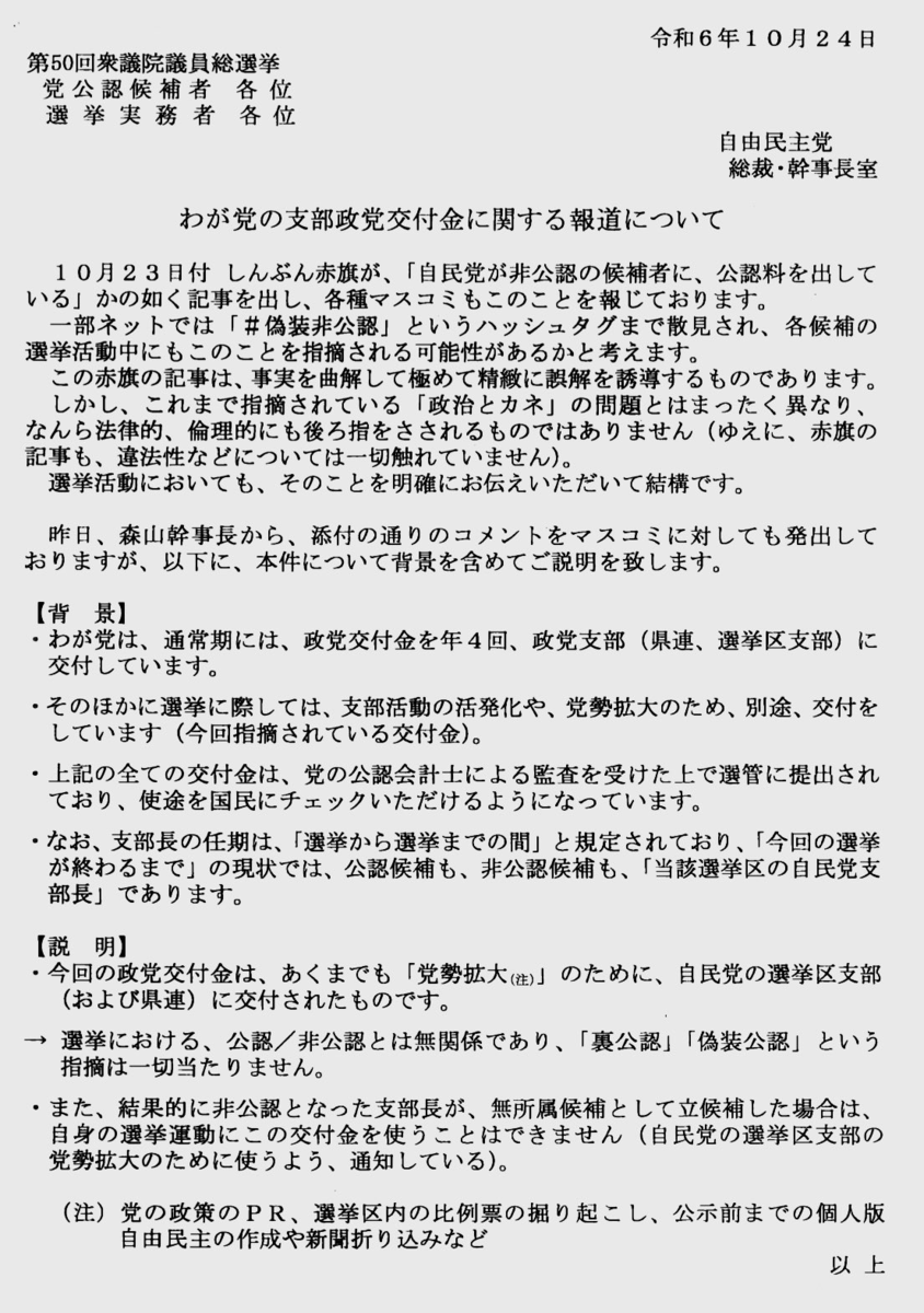 この度、非公認候補に対して自民党本部から政党交付金が支給されたとの報道がありました。当方としても報道されるまでまったく存じ上げず、確認をして初めて、私が支部長を務める自民党東京都第24選挙区区支部の政党交付金専用口座へ2000万円が、選挙公示後の10月16日付で振り込まれたことを確認しました。当然、今回の選挙費用としてまったく使用しておりません。政党交付金は一般的に党勢拡大のために使われるものでありますが、今回は私は無所属候補でありまして、自民党のマニフェストさえ届いておらず、党勢拡大の何についていったい使用できるのか、非常にわかりにくく誤解を招くものであると感じております。そのため、なぜこのような選挙期間中に支給を決定したのか、また、事前に連絡も無かったのか、執行部の判断に対して大変疑問を抱いてます。これまで私は執行部への批判を控え、目の前の選挙に専念をしてまいりました。しかし、率直に申し上げて、選挙直前の非公認の基準、そして今回の政党交付金の交付に関する執行部の対応、首を傾げざるを得ません。そもそも個人的な関係でも閣僚や或いは党幹部は応援に行ってはならない、そのくらい厳しい対応をしているにもかかわらず、突然このような資金を振り込まれても正直申し上げて有難迷惑な話だと思います。選対の幹部の皆さんは、裸一貫、とにかく無所属で頑張ろう、皆さん心を一つにして戦っている最中にこのような報道が起こること自体が我々にとっては迷惑な話です。今回の政党交付金については、あらぬ誤解を招いているため、返金も含めた対応を自民党本部と協議してまいります。引き続き無所属候補として正々堂々と選挙戦を戦い抜く決意でございますので、皆さまのご理解とご支援、心からお願い申し上げたいと思います。