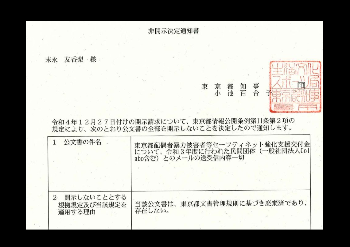 末永氏の非開示決定とされた通知書には「令和3年度に行われた民間団体(一般社団法人Colabo含む)とのメールの送受信内容一切」について「東京都文書管理規則に基づいて廃棄済みであり存在しない」とありました。