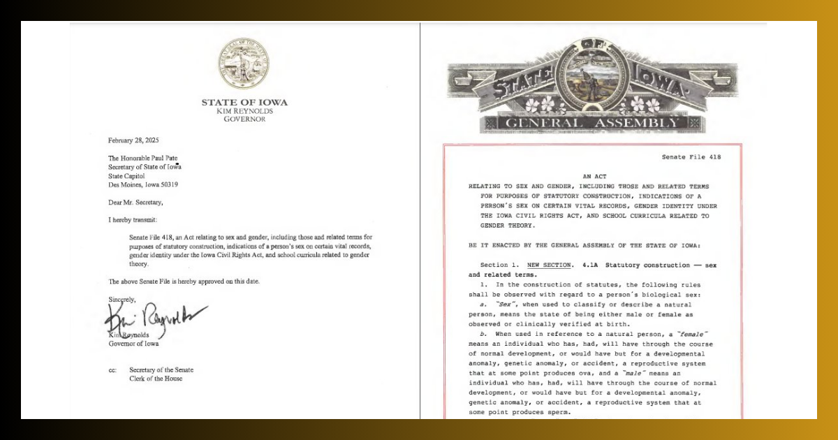 アイオワ州公民権法(Iowa Civil Rights Act of 1965=CHAPTER 216)において雇用、住宅、教育、公共施設などの利用における差別からアイオワ州民を保護する属性の対象からジェンダーアイデンティティを外すなどする改正法【Senate File 418】が州議会で可決され、州知事が署名したために有効となります。