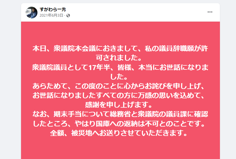 2021年6月に辞職した菅原一秀議員(当時)の場合は本人が以下報告しています。