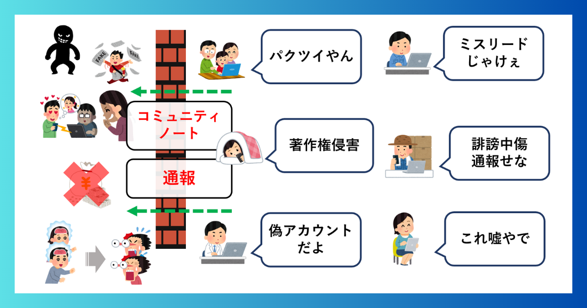 収益化をしている者でもノートが付いた投稿からは収益が発生しない仕組みなので、パクツイ・著作権侵害投稿など、虚偽情報では無いにしろ不正な利益を得る目的での利用者から不当利得を剥奪することができます。