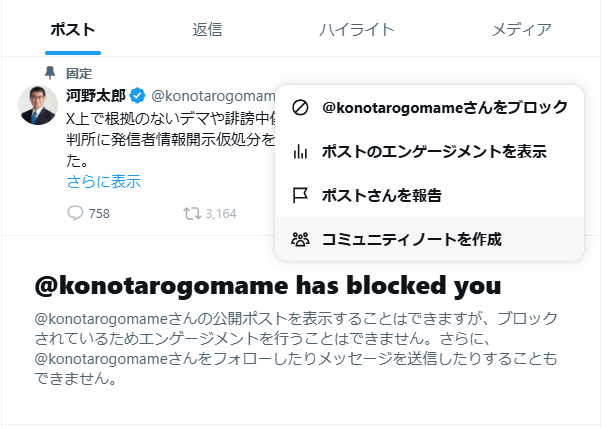 まず、ブロックされた場合=被ブロックの立場ならば、従来は投稿もプロフィール画面も見えませんでした。それが投稿が見えるようになったことで、通報やコミュニティノートを付与するタブが表示されるようになりました。