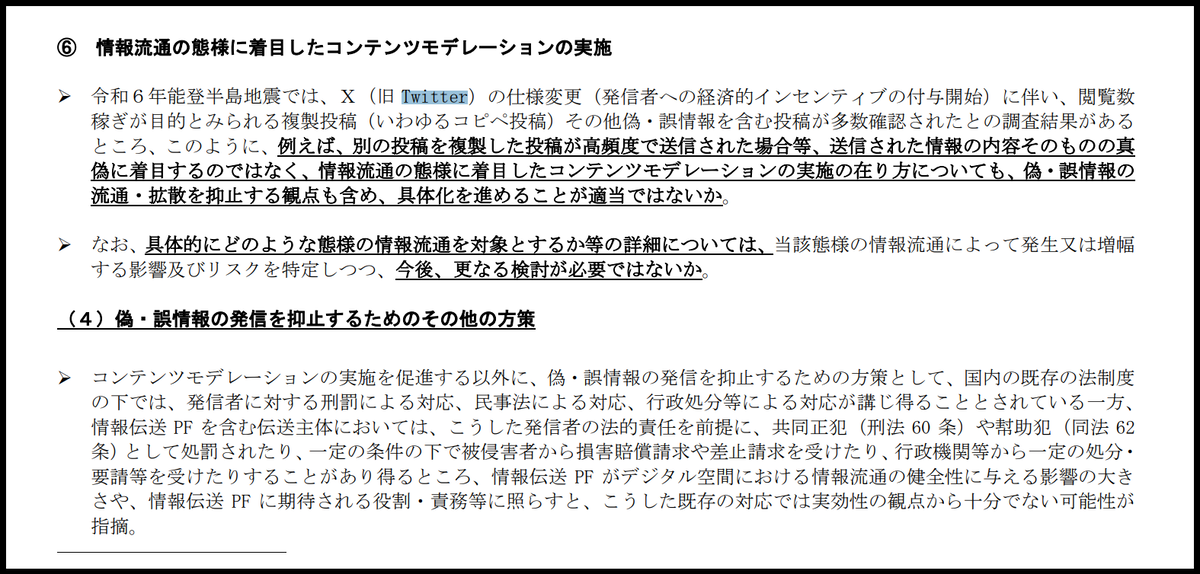 能登半島地震の際、虚偽の救助要請投稿とその転載が相次いだことに、政府はガチ切れしてます。既に、新型コロナ禍の際や自傷行為に関する検索をTwitter内で行った際には注意喚起の表示がされるなど、政府はプラットフォーム事業者、特にX(Twitter)側に対して要求し、一定程度を反映させてきた実績があります。