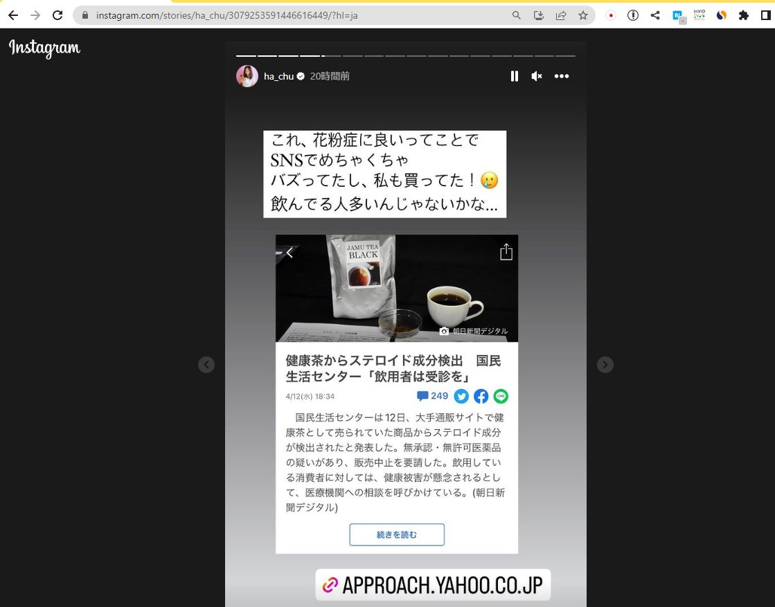 WEBインフルエンサーの「はあちゅう」(伊藤 春香)が、自身のブログで今回ステロイドが検出されることが明らかとなったジャムティーをアフィリエイトを貼っていました。