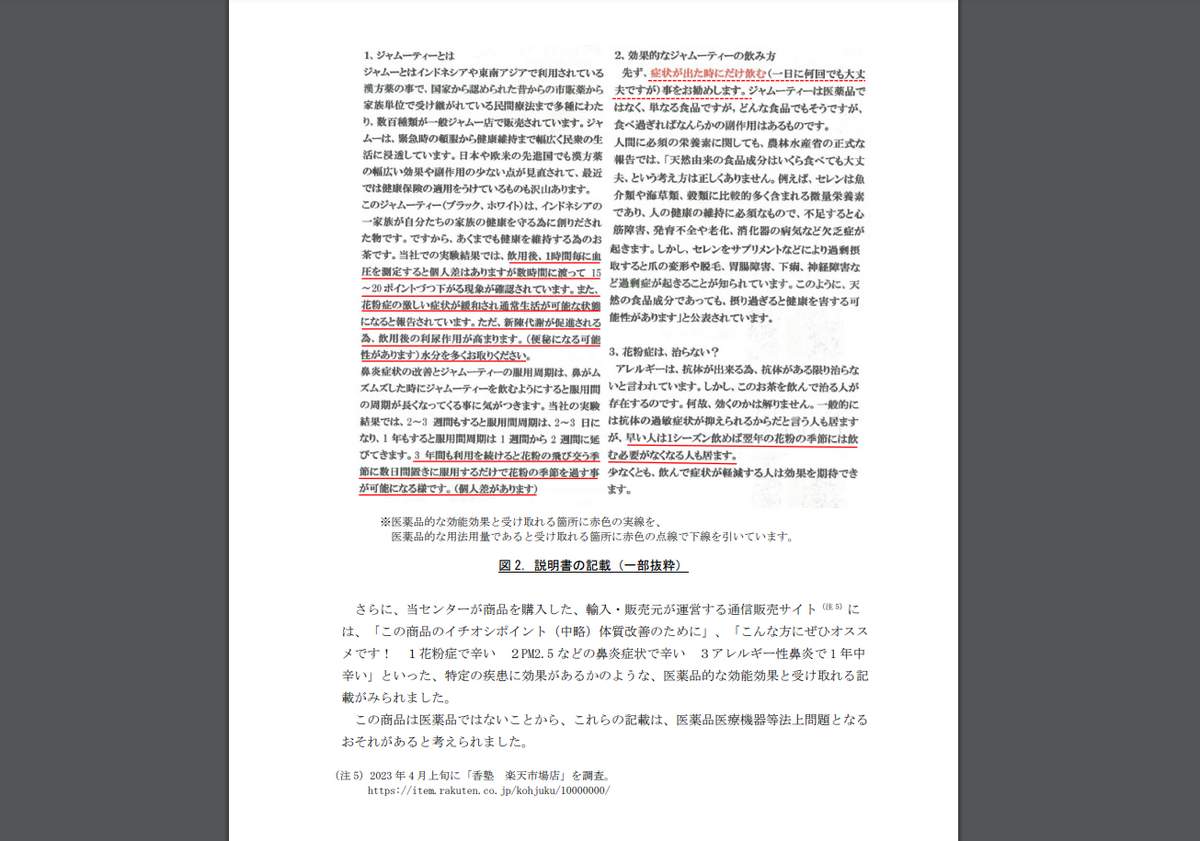 国民生活センターの報告書では「薬機法上の問題となるおそれがある」旨の指摘があります。薬機法66条等の責任主体に「何人」があるのでアフィリエイターも対象です。