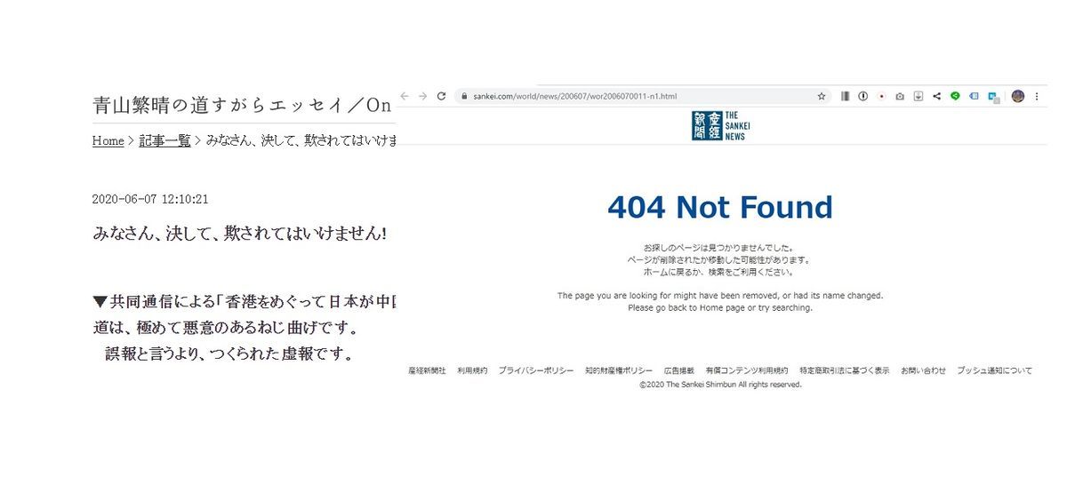 共同通信のこの記事は報道各社においても転載されていましたが、産経新聞においては記事が削除されました。