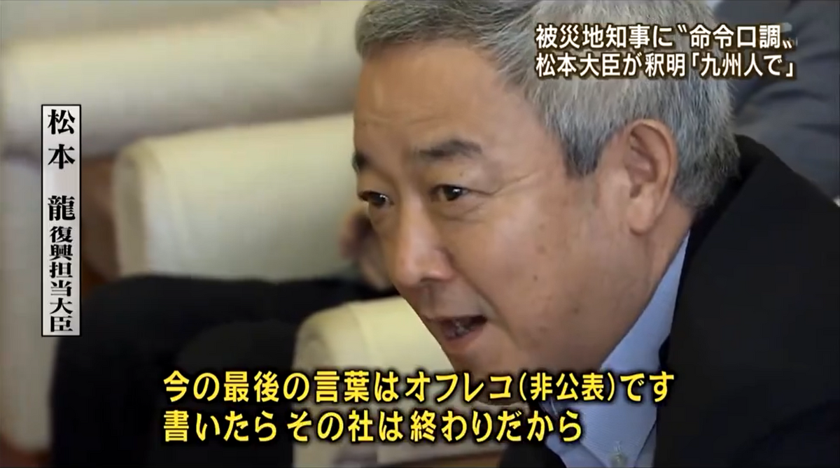 松本復興相 今の最後の言葉はオフレコです。みなさん、いいですか。(取材に来たマスコミに対して)書いたらもう、その社は終わりだから。――松本大臣のこの言動は波紋を呼びそうです
