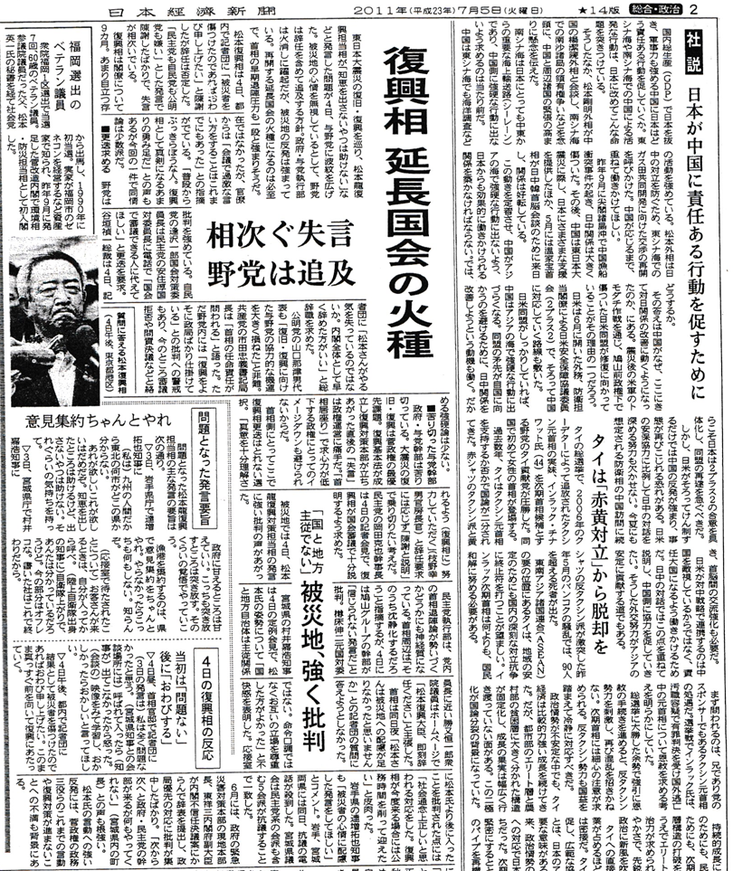 朝日新聞 社説 復興相発言―こんな人では心配だ 2011年7月5日(火)付