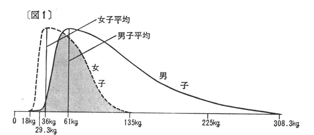 しかし、(コンタクトスポーツを念頭に)TOPレベルのアスリートは、上の図の女子で言えば135kg付近の者の世界と言え、そこに男子の競技者が到達するのは遥かに容易です。