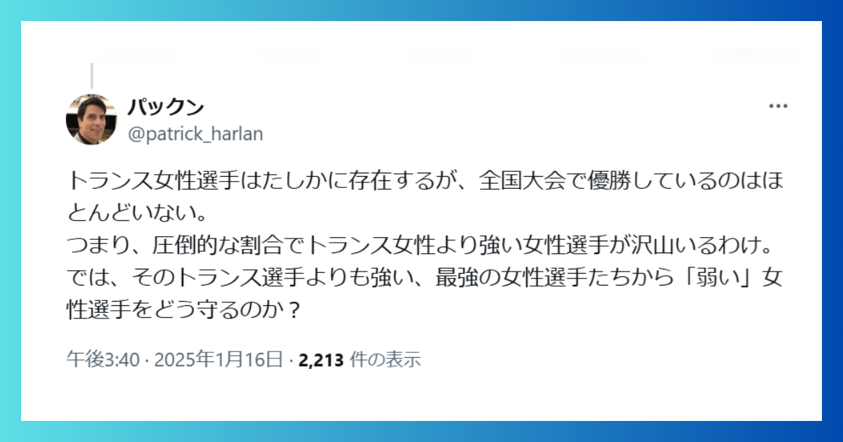 パックン=パトリック・ハーラン氏は、男女間に身体能力の差があるために女性選手の安全のためにトランス女性(=生得的男性)の選手から守るためだと主張されているが、「強さ」の制限ではないことに疑問を提示した上で上掲投稿をしました。
