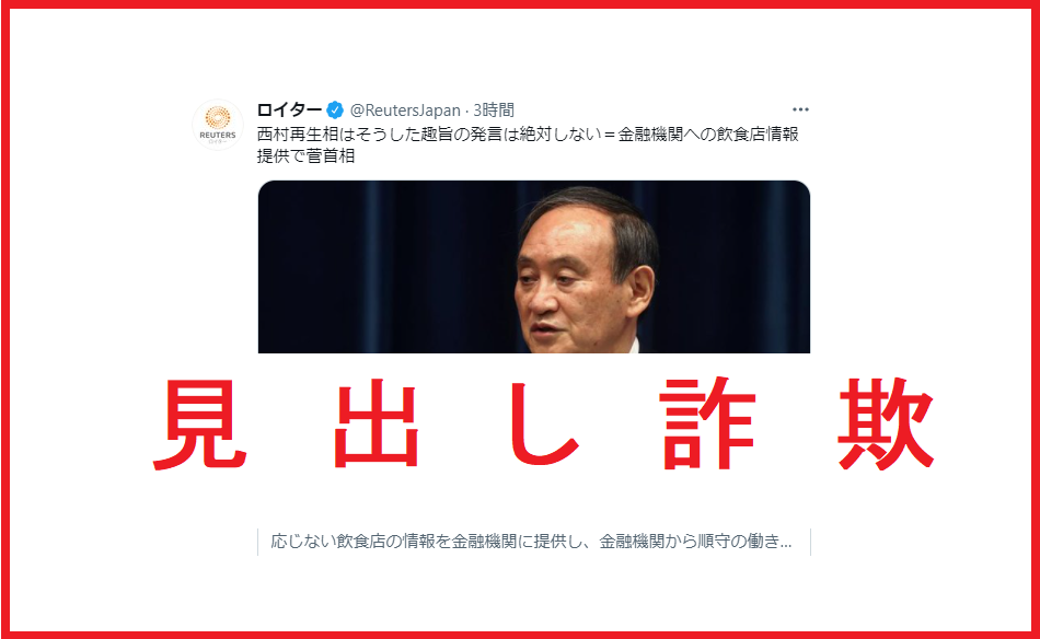「西村再生相はそうした趣旨の発言は絶対しない=金融機関への飲食店情報提供で菅首相」(魚拓)というロイターの記事に釣られてる人が多過ぎて辟易とします。