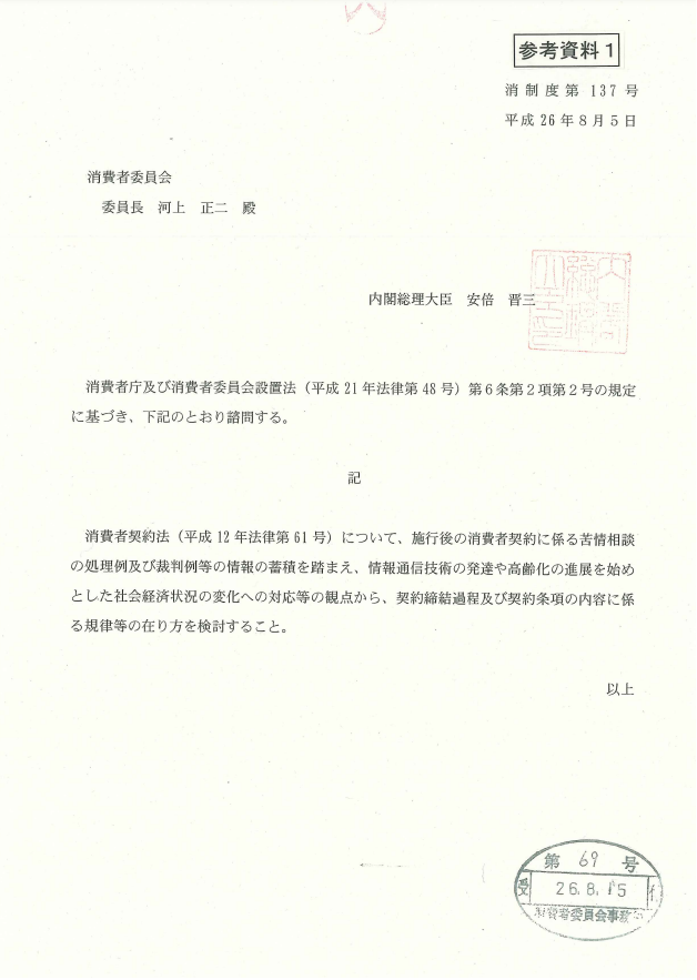 内閣総理大臣安倍晋三から消費者委員会に対して諮問があり、「高齢化の進展を始めとした社会経済状況の変化への対応等の観点から、契約締結過程及び契約条項の内容に係る規律等の在り方を検討すること」とされました。
