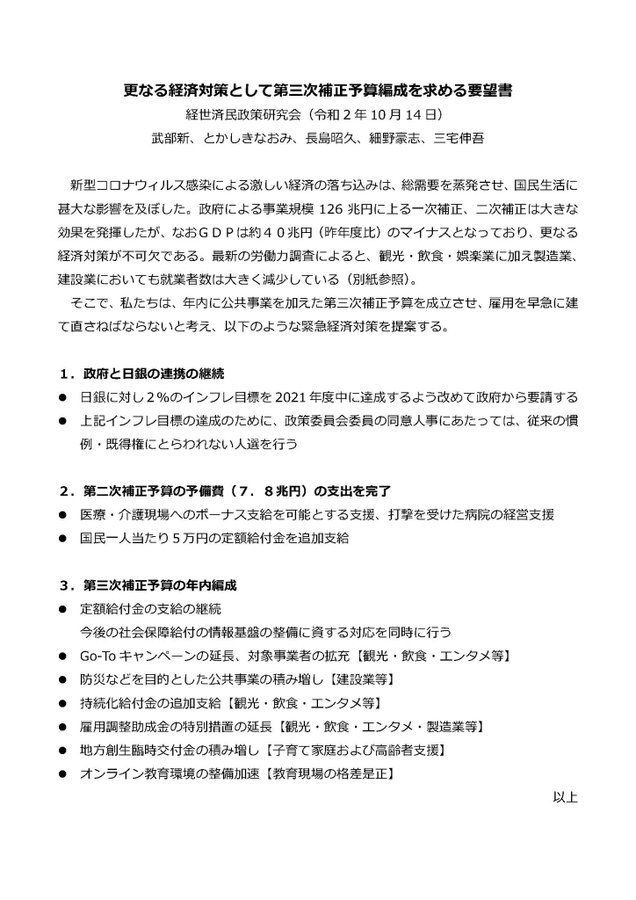 先程、官邸に菅【すが】義偉総理を訪ね、「経世済民」政策研究会の仲間と真水で約40兆円規模の第三次補正予算を含む緊急経済対策についての提言書を手渡してまいりました。顧問の田中秀臣先生にもご同行いただき、短時間でしたが有意義な意見交換ができました。余談ですが、総理は覇気が漲ってました。 pic.twitter.com/rDesSLGyFV