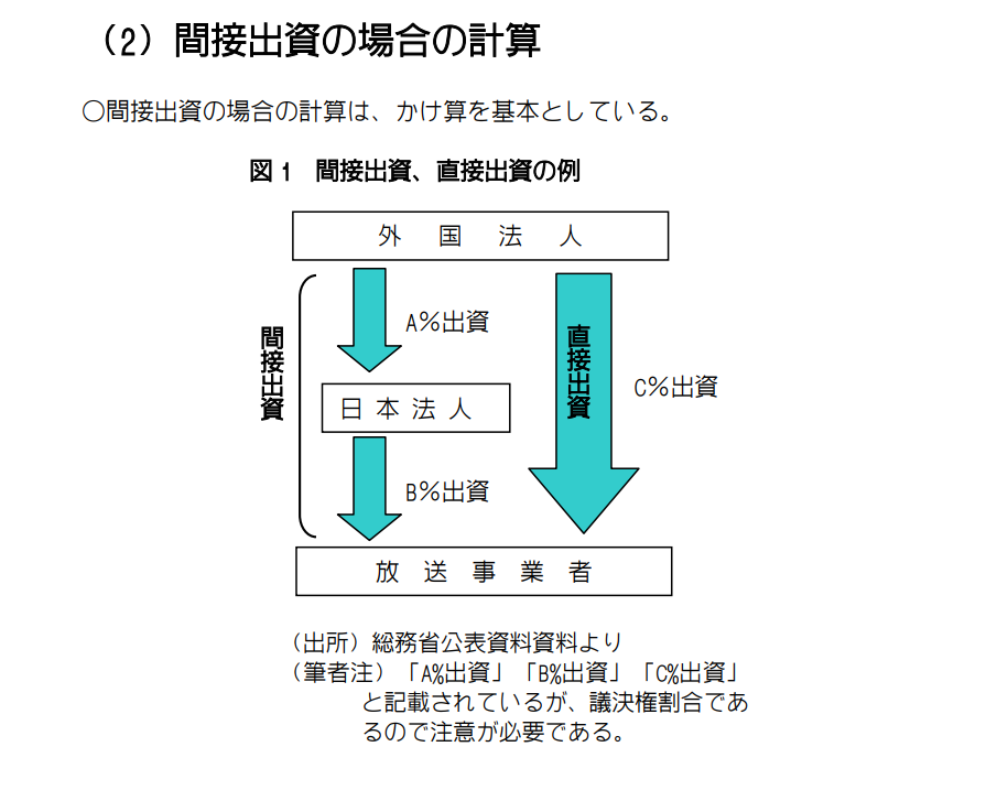東北新社が外資規制違反であるために放送事業認定取消しになることが報道されていますが、「外資20%規制」は、株式保有率をそのまま意味するものではありません。