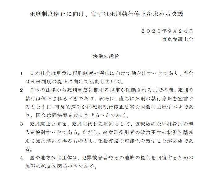 東京弁護士会の死刑制度廃止に向けた死刑執行停止を求める決議